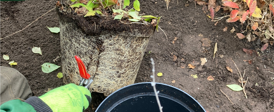 Container:    Entfernung des Containers und anschließend den Wurzelballen Aufreißen oder Anschneiden (Blumentopf-Effekt)(siehe Bild oben).